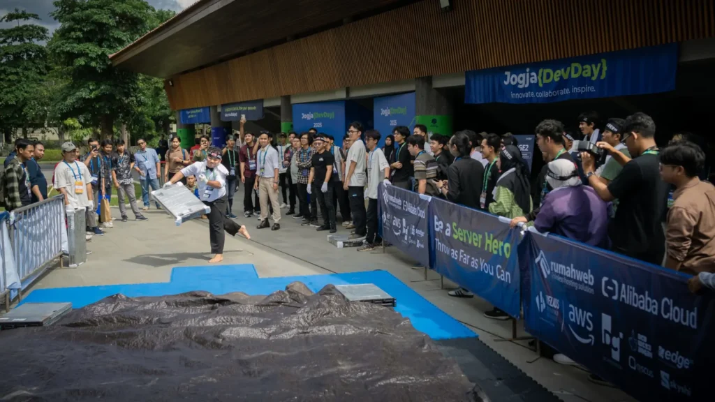 Tak hanya seminar, Jogja DevDay 2025 juga menampilkan berbagai kegiatan seru, termasuk Lomba Lempar Server, yaitu kompetisi paling unik di mana peserta melempar server fisik seberat 20 kilogram sejauh mungkin. Bukan virtual, tapi server sungguhan.